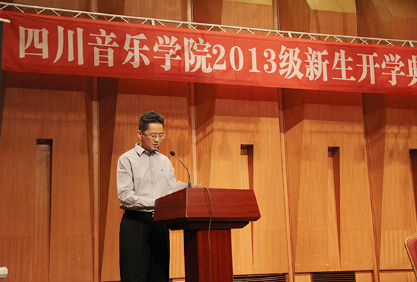 院长易柯教授在开学典礼上讲话。他代表四川音乐学院全体师生员工向来自祖国各地的新同学表示热烈欢迎。他向新生们介绍了学院的发展概况并提出了几点要求和希望:一、转变角色、勤奋学习。二、积极上进、立志创新。三、崇尚文明、团结互助。四、加强修养、完善自我。他说,今年是全面贯彻落实党的十八大精神的开局之年,也是学校科学发展的关键一年,希望同学们秉承“尚美、创新”的校训,坚持“为祖国歌唱,为社会奉献”的理念,结合“中国梦、川音梦”和“党的群众路线教育实践活动”,振奋精神,为努力创办人民满意的四川艺术大学而努力。