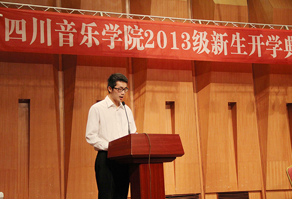 新生代表现代器乐系学生张一民发言,他说,今天我们带着崭新的希望、亲人的嘱托、朋友的祝福,迈进了这所有着73年悠久历史的艺术殿堂。踏进川音校门我们兴奋不已。 千里之行,始于足下。我们将尽快转变角色,适应新环境,遵守学校的各项规章制度,铭记学院领导对我们提出的要求,勤奋学习,刻苦钻研,不断完善自我,提高自身素质,以优异的成绩回报老师和家人,以丰硕成果回报亲爱的母校。