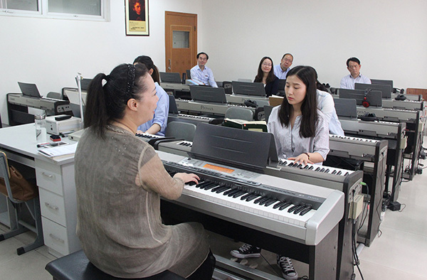 在随后的检查工作中,专家组深入课堂,查看了教育硕士的《自弹自唱与即兴配奏》教学情况,并将课程简介、教学大纲、课程教案、教材选用等问题与任课教师、硕士生导师、在读研究生进行了充分的交流。同时查阅了学校有关研究生管理方面的规章制度。专家组还深入到我校电子音乐专业重点实验室、但昭义教授大师工作室,了解我校艺术学科综合发展的办学目标与培养特色,充分肯定了学院的办学思路与发展现状。