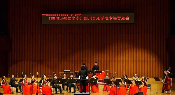音乐会在女声小合唱《采花》中拉开了序幕。本场音乐会为观众们展现了多种风格类型的四川民歌作品,如生动活泼的四川秀山民歌挑担号子《黄杨扁担》;富有四川清音哈哈腔特点的《小放风筝》、《布谷鸟儿咕咕叫》;刚劲爽利的四川山歌《太阳出来喜洋洋》及饱含深情的《槐花几时开》;还有观众们耳熟能详的谣曲类情歌题材《康定情歌》等。音乐会运用了四川清音、重庆啰儿调等具有民族特色的表现技法,精彩地呈现了四川民歌的独特魅力与巴蜀风情。我校民族管弦乐团还演奏了由我校党委书记兼院长、著名作曲家林戈尔教授创作的《藏区小景》、《节日欢歌》,旋律欢快,极富民族特色。民乐团的器乐伴奏也引人瞩目,宛转动听的器乐韵律中透散着四川本土的音乐气息。歌声、琵琶声、胡琴声、鼓声等众多声响汇聚一堂,声动梁尘、洋洋盈耳。音乐会指挥与演唱者默契配合,乐队演奏家们倾心投入、乐曲处理到位,都展现了高超的专业水平,营造出优美的音乐艺术境界。