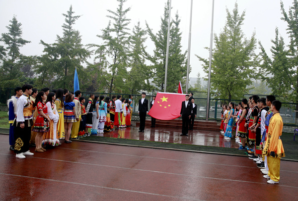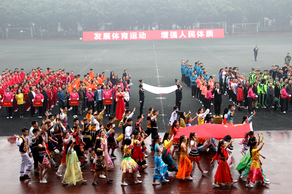 开幕式上,国旗队、会旗队、党政工团、以及各院系由师生组成的30个方队,冒着绵绵细雨,迈着矫健整齐的步伐,英姿飒爽地依次入场。观众席上座无虚席,师生们为入场方队摇旗呐喊助威。随后的啦啦操、流行舞蹈和行进乐队表演渲染出运动会浓郁的艺术气息,充分展示了艺术院校的专业特色,精彩的表演赢得了全场观众热烈的掌声和喝彩声。伴随着我校三位师生演唱的《歌唱祖国》,身着五十六个民族服装,朝气蓬勃的青年学子们迈着欢快的步伐,擎着鲜艳的五星红旗,经主席台前奔向国旗台。在庄严的国歌声中,五星红旗冉冉升起。升旗仪式后,党委副书记侯钫宣布2016年度最佳男、女运动员和先进集体三个奖项;副院长牟文虎宣布2016年度“合力杯”女子篮球赛和男子篮球赛