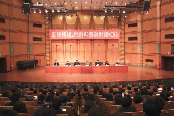 四川音乐学院全面从严治党暨学习贯彻省委读书班精神工作会,于2019年2月27日在大音乐厅举行。在家校领导校党委书记洪流,院长、校党委副书记周思源,省纪委监委驻四川音乐学院纪检监察组组长、校党委副书记、纪委书记魏文彪,副院长文云英、孙洪斌、牟文虎、文锋出席会议。全校副科级以上干部,以及各党总支、直属党支部纪检委员参加会议。