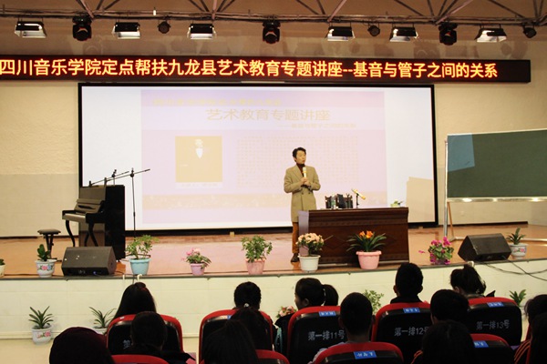 14日,我校民族声乐系教授、副系主任谭学胜,在九龙高级中学做主题为《基音与管子之间的关系》艺术教育专题讲座。讲座吸引了,该校师生、当地文艺工作者、音乐爱好者和普通群众,500余人参与。谭教授分享了自己从一名音乐爱好者通过不断的努力学习考进川音这所艺术殿堂求学,再到成为一名艺术工作者和音乐教育者的经历;讲诉了艺术审美对艺术学习的重要影响;阐述了声乐学习中科学的发声方法和共鸣技巧。并邀请自己的学生,我校优秀教师、青年歌唱家们上台演唱不同风格的民族歌曲,进行赏析讲解。整场讲座并非把专业书的理论照搬过来,而是用最通俗的话语,介绍声乐的基本知识。激发了观众的学习热情,不少观众做了笔记,现场不时引发阵阵掌声,气氛非常热烈。在提问环节,谭教授对当地文艺、教育工作者,提出的疑问做了解答。对在声乐学习中遇到困惑的学生,给出了专业建议和鼓励。当地听众的热情也打动着谭教授,他表示,作为一名人民教师和艺术工作者,希望通过讲座、文艺下乡等形式为贫困地区、偏远地区的学生和群众带去文艺、教育的种子,提高当地人文素养,提升文化自信,为学校对口帮扶工作和国家实现全面小康社会贡献自己的力量。