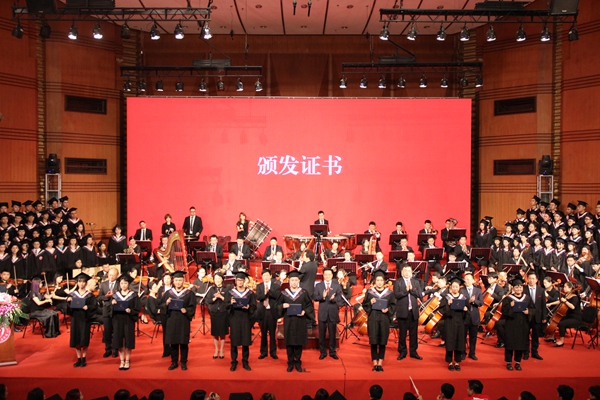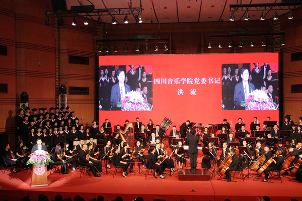典礼伊始播放了学校将传统民乐和现代流行乐结合起来重新编曲的《我们都是追梦人》视频,以《歌唱祖国》为主题,同时将《东方红》主题巧妙融入其中,由师生们倾情演绎,展现在川音求学的经历和成长,铭记母校恩情、感怀师生情谊。此次毕业典礼首次采用交响乐团现场配乐、学生合唱团现场演唱的方式进行,用优美而震撼的音乐衬托着2019届毕业生们青春与梦想的奋斗故事。而今年又恰逢建国70周年、建校80周年,在校领导、师生及家长代表肃立齐唱国歌的庄严时刻,整个会场更是充满了庄重而热烈的气氛,萦绕着毕业学子们爱国爱校的深厚情怀。