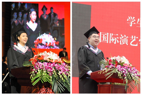 毕业生代表、歌剧合唱系王萌艺和国际演艺学院许晋墉代表2019届全体毕业生向母校、师长致以崇高敬意和诚挚的感谢。他们说:“回首四年,感慨万千,四年的知识积累、汗水灌溉,让我们得以破茧成蝶、梦想成真,这都离不开老师们的谆谆教诲和言传身教。八十年薪火相传,八十年弦歌不辍,母校指引着我们对美的崇尚与追求,用高尚的文艺引领社会风尚是我们川音人永远的追求。我们都是追梦人,愿我们携手共进,在今天勇敢地向未来报到。”