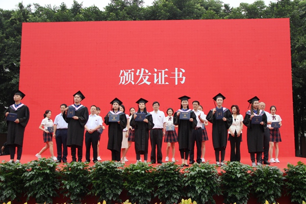 随后,校领导向毕业生代表颁发毕业证书,并祝贺同学们圆满完成学业。万里送行舟,道不完求学数载路;远送从此别,说不尽今生师生情。