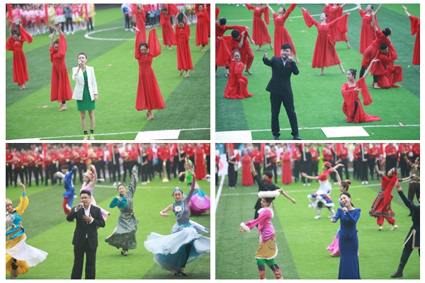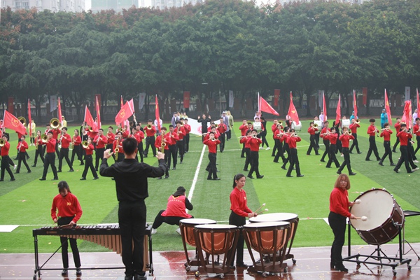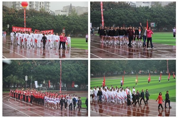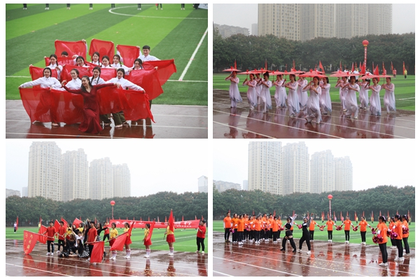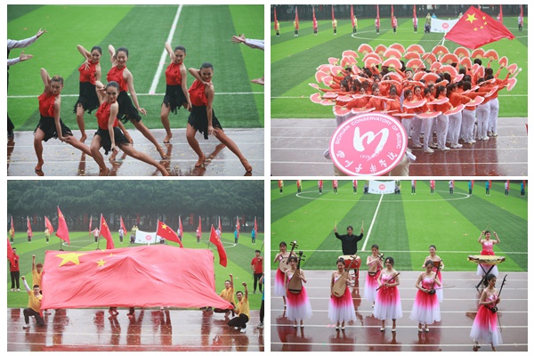 开幕式虽逢秋雨绵绵,却浇不灭川音人高昂的斗志。校领导走下主席台,在雨中与师生们共迎各个运动代表队入场。伴随着激昂的《运动员进行曲》,国旗队、校旗队、会旗队、教工代表队以及26个院系代表队身着统一的服装,迈着整齐的步伐依次入场。不到100米的跑道,既是各代表队才艺和创意pk的擂台,又是展示各自学科特色和文化底蕴的舞台。音乐教育学院的行进乐队表演,以娴熟的演奏技巧和默契的团队合作呈现了川音人的艺术风采。流行音乐学院流行舞专业学子用现代舞的形式向观众展示了新时代中国青年人蓬勃的活力。声乐系、民族声乐系和流行音乐学院青年教师以及80余名学子,用歌声和舞蹈表达了川音人对新中国成立七十周年、对川音建校八十周年的美好祝福。