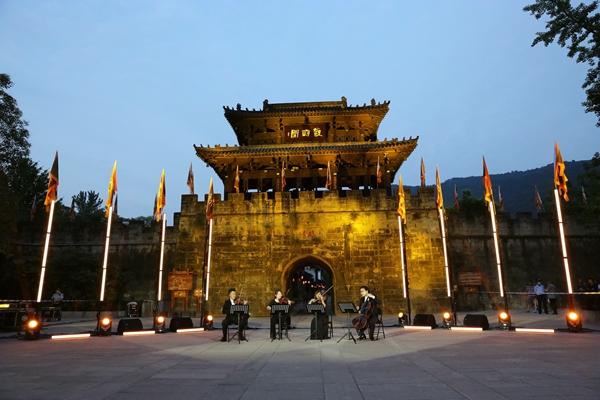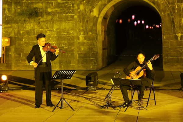 本场演出由知名旅德小提琴演奏家、我校特聘教授、成都音乐家协会副主席王微致,我校交响乐团首席大提琴赵明玮,我校青年中提琴演奏家范星,管弦系青年教师蔡茜,我校外聘教授、吉他演奏家约瑟夫•佩雷兹•米兰蒂里亚联袂带来弦乐盛宴。演出在莫扎特的《d大调嬉游曲》第三乐章旋律中铺陈开来,欢快的节奏乘着月光飘扬在古城上空。电影《教父》的主题曲《温柔的倾述》和电影《辛德勒名单》主题曲让在场观众感觉耳熟能详,不自觉地跟随着旋律轻轻哼唱。艺术家们还演奏了柴可夫斯基的《如歌的行板》、巴赫的《大提琴无伴奏组曲第二号 前奏曲》这样的世界名曲。当本由中国传统乐器琵琶演奏的经典名曲《十面埋伏》被改编成小提琴和吉他的弦乐协奏曲奏出时,现场的气氛达到了高潮,用音乐之旋律勾勒出的极具历史厚重感的画面缓缓呈现,栩栩如生,让人仿佛梦回金戈铁马的征战岁月,与葭萌关下刘备操练兵马、张飞挑灯战马超的三国文化交相辉映。