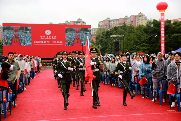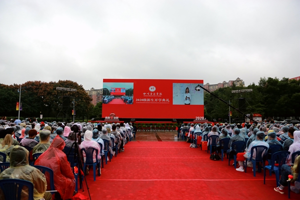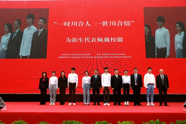 现场气氛热烈而庄重。在“一时川音人 一世川音情”环节中,校领导和教师代表为2020级新生代表佩戴校徽。校徽承载着川音“尚美、创新”的校训,寄托着川音“明德、博学、尚艺”的精神,彰显着自此成为“川音人”的使命与荣光,现场师生挥舞着国旗,欢呼声、掌声不断。