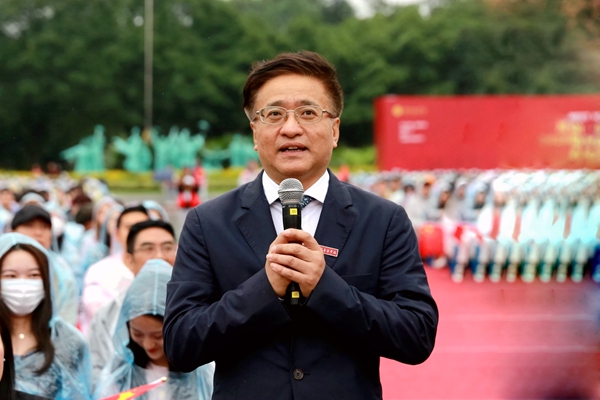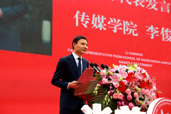 教师代表传媒学院教师李俊文在锦江校区分会场发言。他说,同学们都来自祖国的五湖四海,是祖国的栋梁之才,大学是追求真理的园地,也是学会逆流而上的历练之塔,同学们应葆有精英意识,真正养成对人类与民族、对国家与社会、对学校对自己的崇高责任感与使命感。