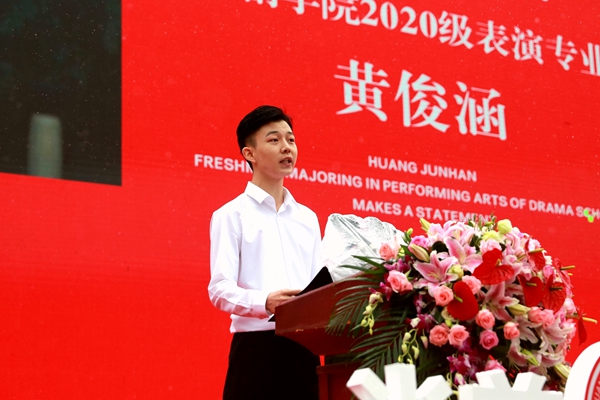 新生代表戏剧学院黄俊涵在新都校区主会场发言。他说,我们都是“川音人”我们将以更高的学习热情来迎接以后的学习生活,以更积极主动的人生态度面对未来的人生道路,努力拼搏,在川音收获属于自己的精彩。