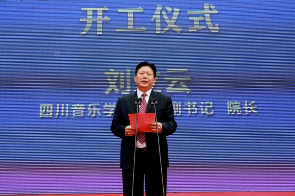 党委副书记、院长刘立云在致辞中,向前来参加开工仪式的各位领导、各位来宾以及各位工程人员表示热烈的欢迎和深深的感谢。他指出:“曾经的爱乐酒店作为成都人民熟悉的一环路标志性建筑之一,见证了川音十余年发展历程,记录了一代川音人的成长故事。它的还建工作得到社会各界、全校师生和川音校友的关注。城市音乐厅落成以来,省、市两级政府多次召集相关部门召开专题会议,研究音艺中心还建工作;学校和城投集团也携起双手,加强协调,尽最大努力加快推进项目进程。可以说,四川音乐学院音艺中心的开工建设,得益于省市党委、政府对学校工作的支持和重视,得益于各级领导对我们的关心和信任,更得益于全体师生共求发展,积极进步的坚韧决心。”