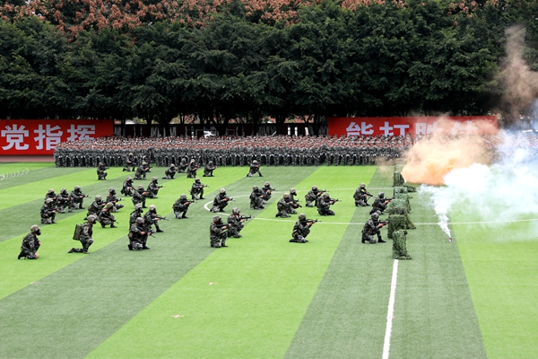 周思源宣布军训汇报结业典礼开始。在管弦乐团现场演奏的《钢铁洪流进行曲》中,各受阅方队精神抖擞地依次通过主席台,他们昂首挺胸,英姿勃发,步履坚定,神采飞扬,以整齐划一的步伐、刚劲有力的摆臂和清脆嘹亮的口号,展示了川音青年昂扬向上的精神风貌。军事训练成果汇报表演中,参训学生们还展示了方字摆阵、军体拳、战术综合演练、刺杀操等,他们意气风发,动作规范。