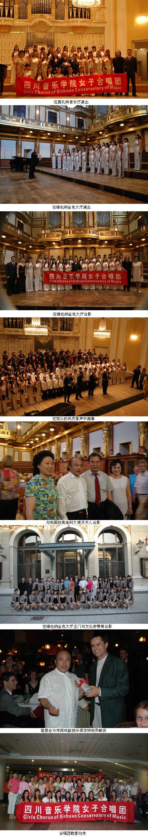 2006年7月3日凌晨,我院女子合唱团一行32人赴“2006年维也纳&萨尔茨堡世界合唱音乐节”金色大厅演出载誉归来。此次演出由李西林副院长带队并执棒指挥。