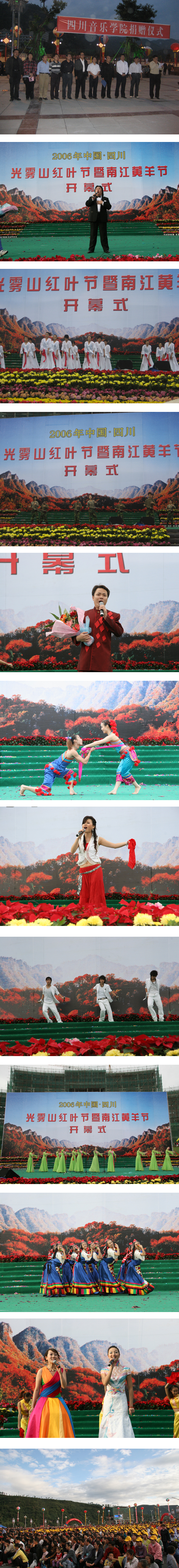 2006年10月18日,为庆祝“中国·四川光雾山红叶节、中国·四川南江黄羊节”的隆重召开,我院师生一行70多人,在著名指挥家、我院副院长李西林的带领下,远赴南江,无偿支援“两节”,献上了一台《红叶情,黄羊颂》大型文艺演出取得圆满成功。