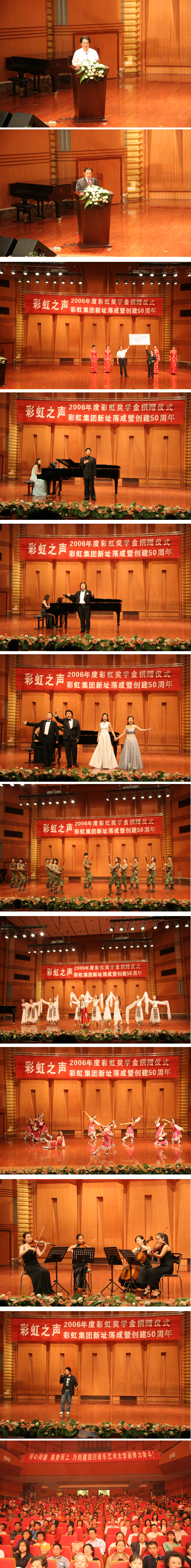 随后,彩虹集团总经理刘荣富将2006年度“彩虹奖学金”奖金十万元捐赠给了声乐二系。接下来的文艺演出节目内容丰富,形式多样,舞蹈、独唱、器乐演奏、女声表演唱等精彩的节目获得了在场观众一阵又一阵热烈的掌声。