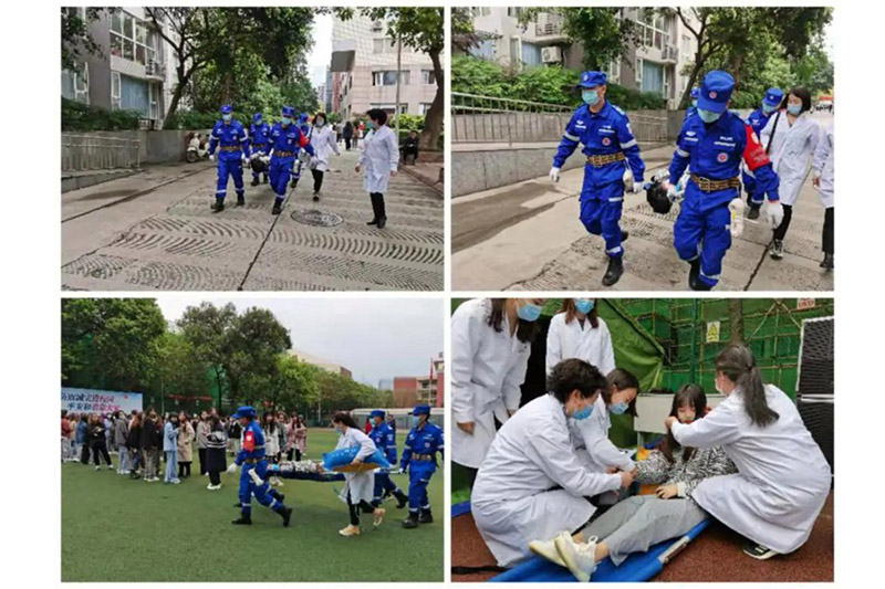 时间就是生命,在地震发生的第一时间,学校20名保安,18名消防战士,16名物业人员,6名校医院医生,快速反应,开上消防车,背上工具袋,扛上担架,提上医药箱迅速赶到现场开展减灾救援。