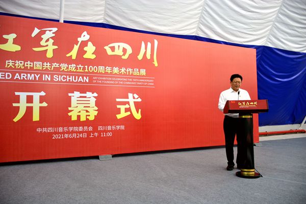 四川音乐学院党委书记周思源宣布红军在四川—庆祝中国共产党成立100周年美术作品展开幕,并对作品展参与创作的艺术家表示了衷心的感谢。周思源表示,社会主义制度下的新中国在世界上具有高度的影响力,我们现在和平安宁的生活,是革命先辈们用鲜血和汗水换来的。中国工农红军完成了史诗般的壮举——长征,而四川是红军长征中路程最长、停留时间最久、活动范围最广的省份,四川各族人民为红军长征的胜利作出了卓越贡献,留下了红军一段段可歌可泣的感人故事。红军长征的胜利会师,确保了革命火种的延续,这次展出反应了我们艺术家对党的热爱,对红军长征精神的深厚情感,作品展通过油画、国画、雕塑、书法四种艺术形式的体现,仿佛又让我们回到了那个难忘的年代,这是一次有着长征意义的党史教育。