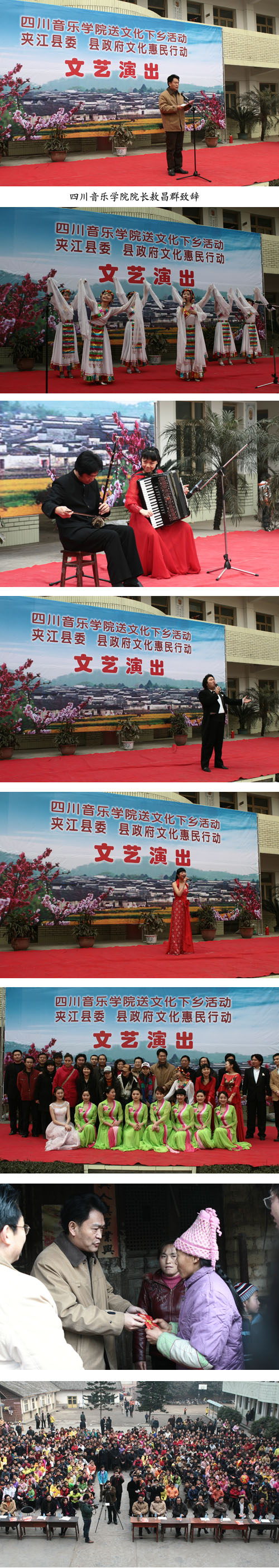 为了贯彻落实省委书记杜青林同志的指示精神,切实开展好春节为基层“送温暖”惠民活动,营造欢乐、喜庆、祥和的节日氛围,四川音乐学院党政领导精心策划,师生们利用寒假的时间组织了一台阵容强大、精彩纷呈的文艺演出节目,在敖昌群院长的带领下,于2007年2月1日晚星夜兼程赶赴夹江, 2月2日上午在夹江吴场镇为基层群众进行了演出。