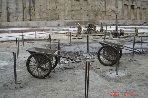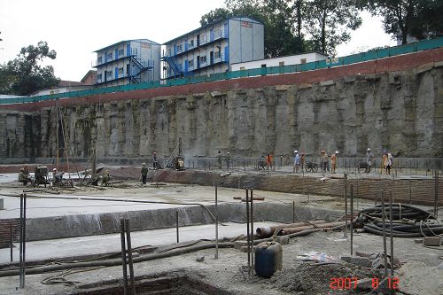 在会上, 张勇副院长指出,教工住宅是全院关心的大事,要对工程的进度做到时时公示,增强透明性。施工单位随后通报了教工住宅工程的进展情况:5月1日完成与土方单位基坑交接,随后在两个月内,克服夜间不能施工等诸多困难,尽可能创造条件,于7月28日完成了基础混凝土换填。为了赶工期、抢进度,在基础换填的同时,于7月12日开始抗浮锚杆施工,8月22日施工完毕,8月26日抗浮锚杆检测合格。8月30日开始防水施工,9月6日通过质检站的验收,9月11日防水保护层施工完毕。目前塔吊已经安装完毕,最近几日内完成调试。力争在9月底完成a区(小户型一侧)的筏板钢筋制作和绑扎。