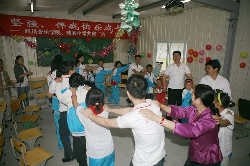 在汶川映秀,由党办、宣传部、音乐学系和四名下派到汶川的挂职干部,与小朋友们一起摆故事、做游戏、吹乐曲、赠汗衫,操场外、教室内听到了久违的笑声、歌声。为灾区的孩子们过了一个又难忘的灾后第一个儿童节。