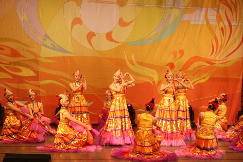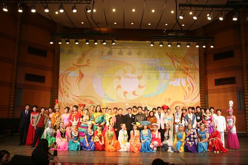 在近两个小时的演出中,中央民族歌舞团深情奉献了近20个民族的声乐、器乐和舞蹈节目。各民族集体舞《花开中华大家园》,藏族歌舞《快乐藏人》,彝族女子群舞《彩霞》,朝鲜族歌舞《阿里郎情颂》,瑶族女子群舞《瑶族舞曲》,哈萨克族女子群舞《可爱的一朵玫瑰花》,蒙古族男子群舞《奔腾》,如花似锦,绚烂缤纷,梦幻般呈现在观众的面前。国家一级演员蓝剑、朴洪哲,歌手苏都阿落、刘婷、张鹏、萨仁其其格的演唱也是千秋独具,唱出了少数民族新的精神风貌,也唱出了尊师重教的炽热情怀。蒙古族演奏员朝克的马头琴独奏、维吾尔族演奏员阿迪力的艾捷克独奏,堪称绝技绝活,使观众眼界大开。整场演出气氛热烈,场面感人。如潮般的掌声、呐喊声此起彼伏。观众竟毫不吝惜地将数分钟的掌声送给了他们。这是对民族歌舞的热爱,也是对高雅艺术的敬意。