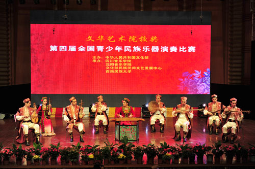 又讯,在沈阳赛区4月23日至27日,文华艺术院校奖——第四届全国青少年民族乐器演奏比赛的弹拨乐器组、打击乐器组及小型民族乐器组合的复赛和决赛揭晓。我院再获两项大奖, 四川音乐学院天籁筝乐团荣获文化艺术院校奖——第四届全国青少年民族乐器演奏比赛小型民族乐器组合演奏奖。同时指导教师江澹曦、陆晶荣获“园丁奖”。组合成员:颜婕、王晶晶、张吟、周桃桃。