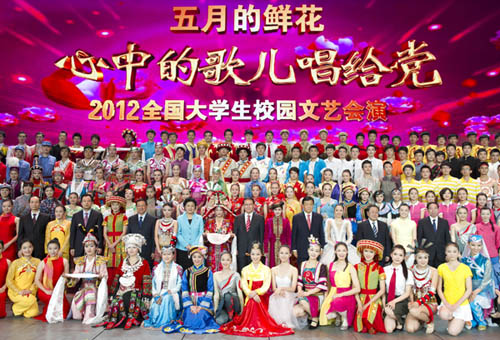 2012年的“5.4”青年节,来自全国70所大学的2500名大学生在中央电视台一号演播大厅举行“五月的鲜花——心中的歌儿唱给党”大型文艺会演。本次活动是由中宣部、教育部、团中央主办,中央电视台承办。中共中央政治局常委李长春,中共中央政治局委员、书记处书记、中宣部部长刘云山,中共中央政治局委员、国务委员刘延东,全国政协副主席陈奎元等领导参加。