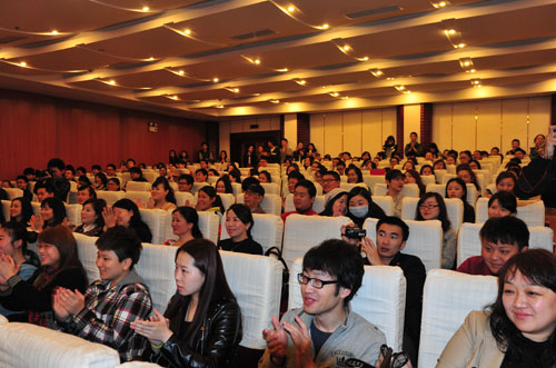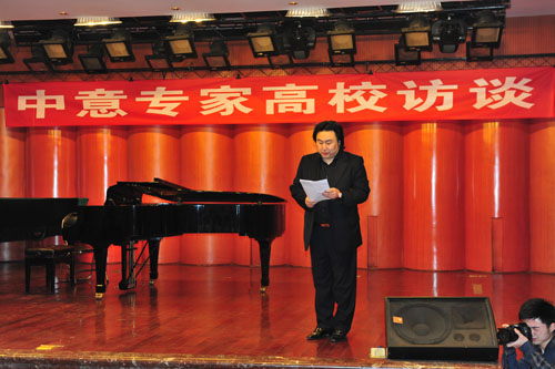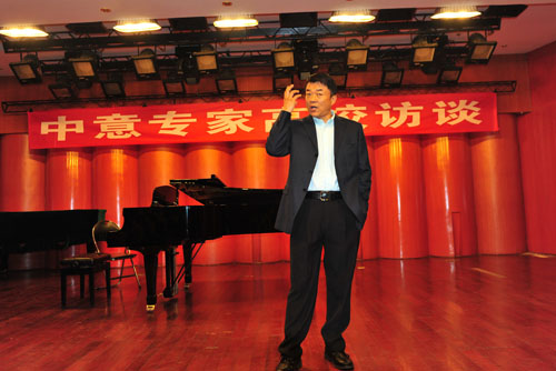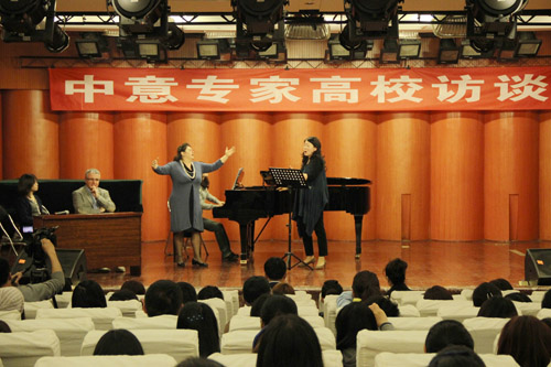 交流活动中,范竞马就声乐学习,国外深造与师生广泛交流,帕尔马皇家音乐学院的克里斯蒂娜.库尔迪教授为我系5名青年教师进行现场辅导。她先进的美声理念、优美的声乐示范、一丝不苟的教学的态度、和蔼可亲的教师形象赢得了欢迎!范竞马先生对师生的演唱作了很好的总结和点评。他希望老师和同学们多唱中国歌,用意大利美声的唱法和方法去唱中国歌。也就是他一直推广的“雅歌”理念。